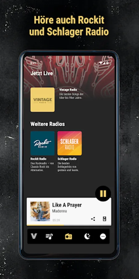 Vintage Radio brings you iconic hits and classics with the best from the 60ies, the 70ies, the 80ies until the 90ies. You hear nonstop music with all the great songs from Abba, Rolling Stones, Madonna, Tina Turner, Queen and Phil Collins, all the way to Elton John or Roxette on your smartphone or tablet computer at no costs.