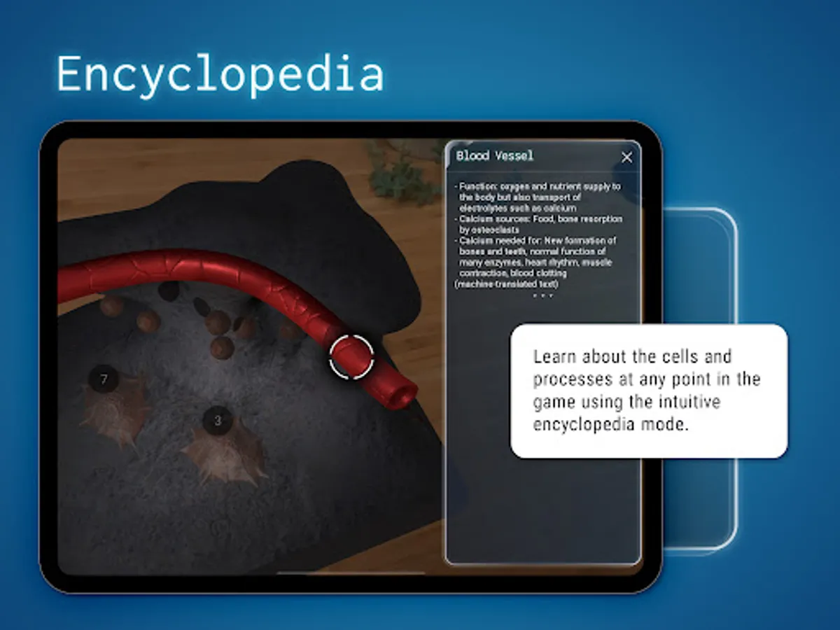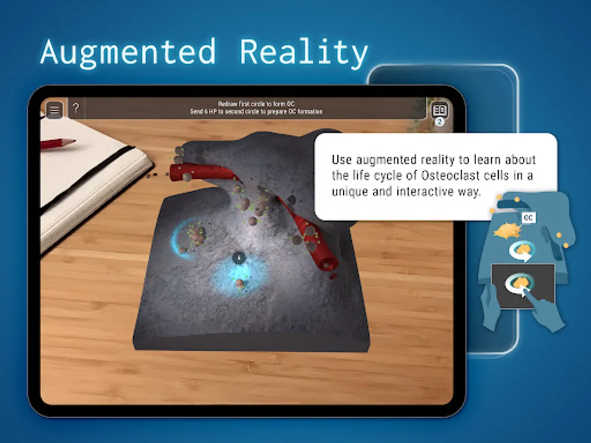 This app accompanies the book “Cell-to-Cell Communication: Cell Atlas – Visual Biology in Oral Medicine” and allows the user to experience the process of bone resorption in augmented reality. AR Osteoclasts draws you into the microcosm of osteoclasts right above the bone surface. In the augmented display, you are zoomed in to the level at which an osteoclast precursor cell appears to be the size of a hand. You investigate the bone resorption process from all sides by moving around the augmented display on top of your book page and you interact with cells to learn more about their function.