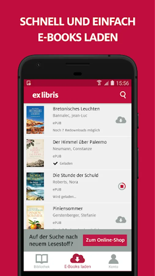 Under www.exlibris.ch you can expand your library from a selection of about 600,000 e-books at any time. After a completed purchase on www.exlibris.ch, you can be forwarded directly to the reader app to start immediately with the reading of e-books.