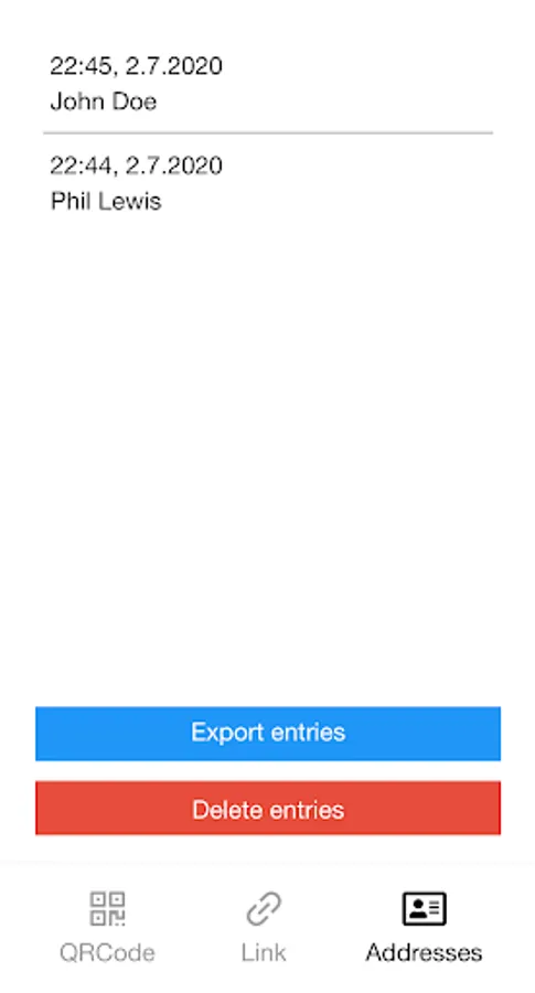 The app generates a JSON object from the entered data and encodes it directly in the qr code, this is verifiable with any qr code scanner. The scanner app reads the code and stores the data in addition to a timestamp. The export function generates a csv locally on the device.