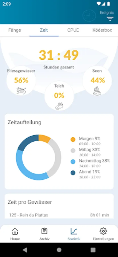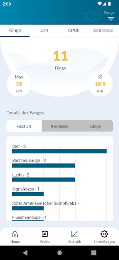 Empty catches as well as the date and duration of the activity are automatically recorded using a so-called start / stop function. This function will make it possible to calculate the CPUE (catch per unit effort) in more detail and thus more meaningfully in the future. As additional options, fishermen can specify the size of the fish and the bait used. The personal fishing activities are shown in individual fishing statistics (e.g. number of fish, fished waters or success rate etc.).