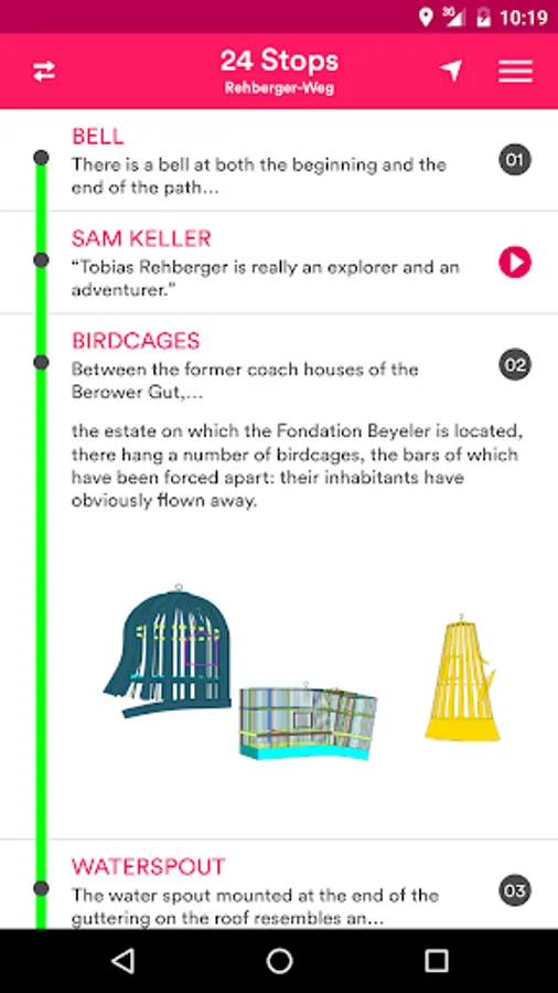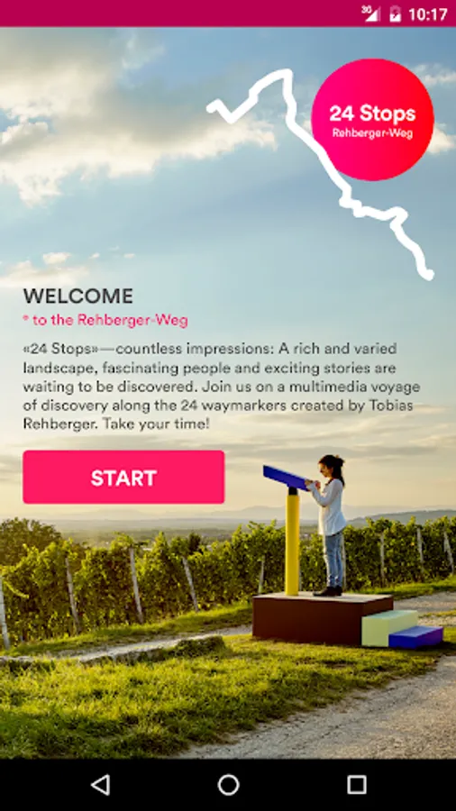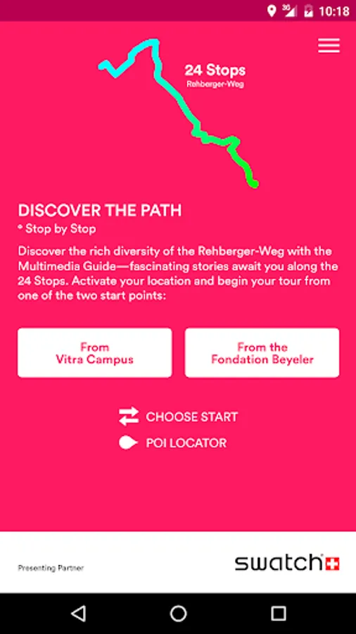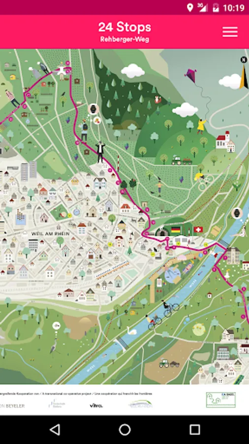 The Rehberger-Weg with its 24 brightly coloured way markers designed by the artist Tobias Rehberger links two countries, two municipalities, two cultural institutions – and countless stories. The «24 Stops» app permits a multimedial experience of the Rehberger-Weg. An audio-guide, short videos, humorous assignments and complementary texts assure a varied an entertaining walk along the path between Weil am Rhein and Riehen, between the Vitra Campus and the Fondation Beyeler.