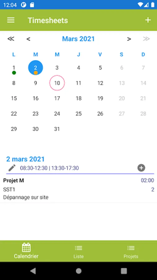 - In the form of a calendar with highlighting of the days with at least one entry of a Time Sheet.