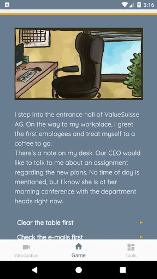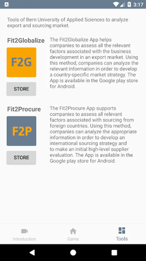 The app game is a text adventure. The players take on the role of Beat Häfeli, who analyses the Russian market for an export company and evaluates a sales partner in Russia. The following publications and tools are main sources for the content of the game: