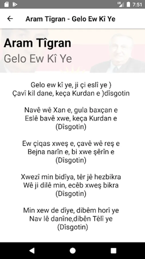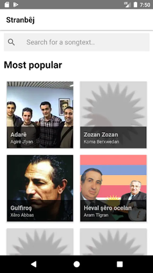 This app holds a lot of kurdish songtext from various kurdish artists. The main purpose of this app is to have a central place where you can find most of the kurdish lyrics available out there. There are much more features planned.