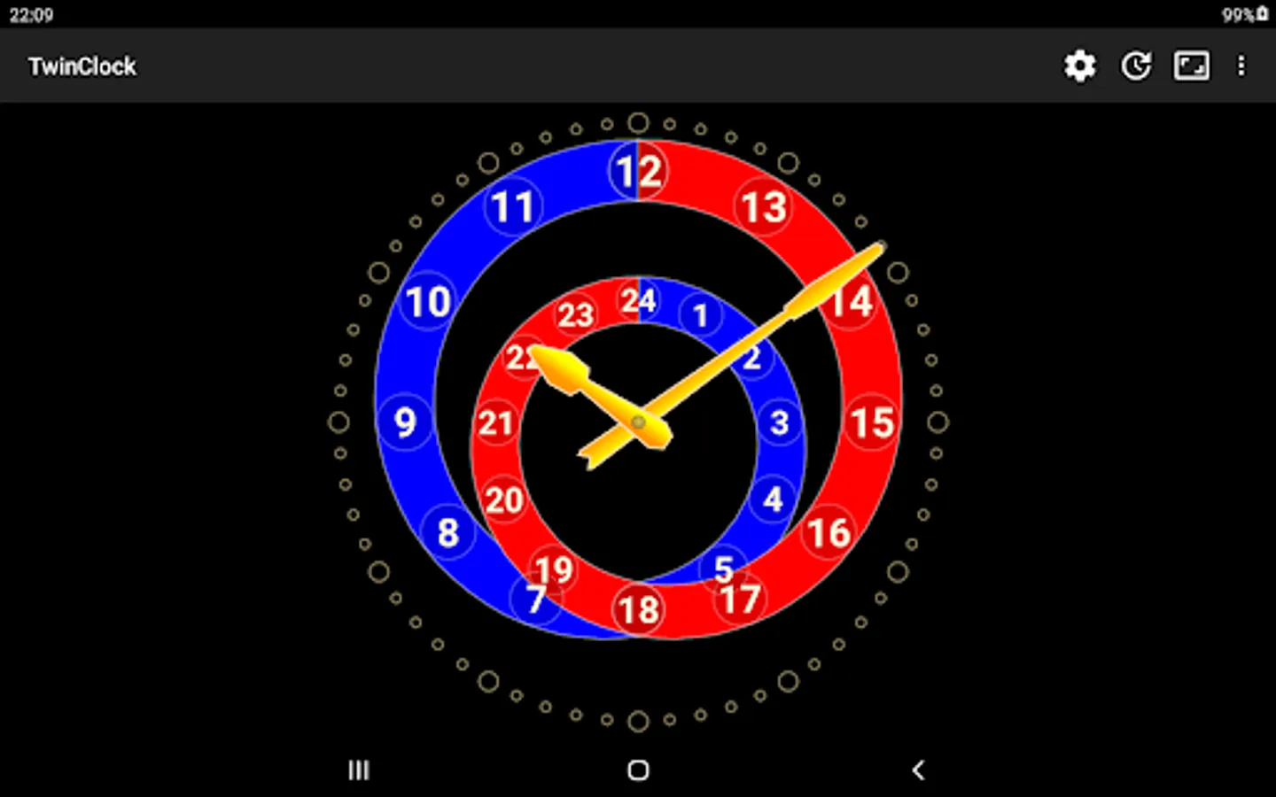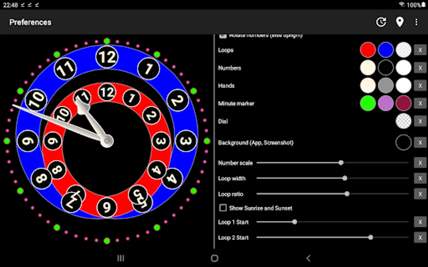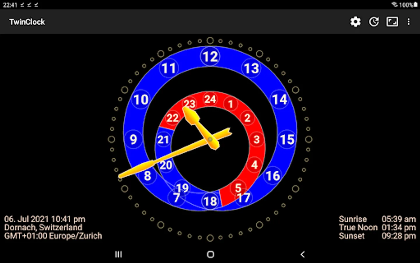 The dual loop clock can also display the day/night rhythm. The sunrise and sunset are calculated from your geo-position and displayed as a color distinction on the loops.