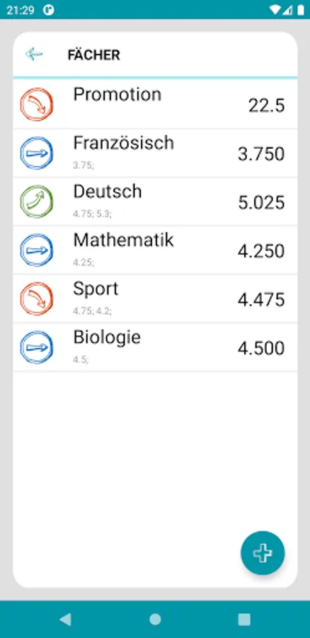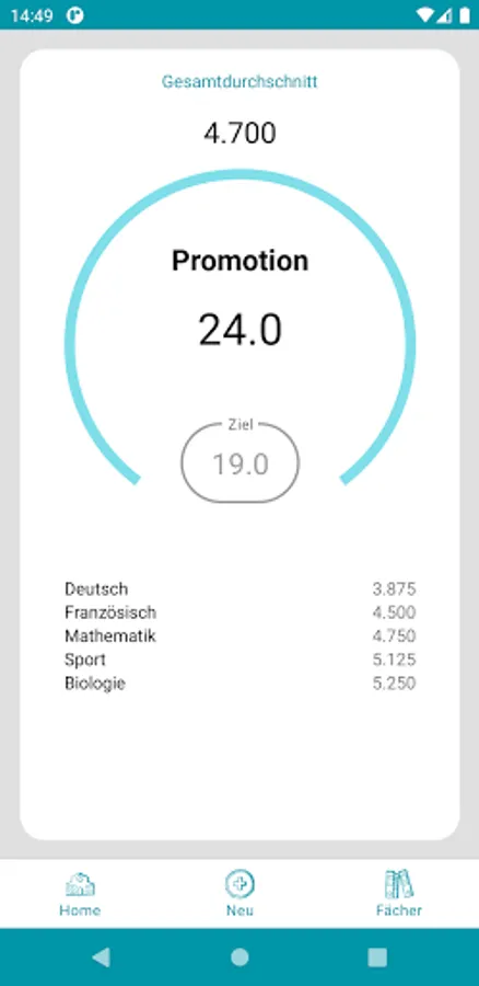 Kanti Notes allows you to manage grades from different subjects. The PhD conditions "Sum of the 5 lowest grades must be at least 19 points" of the Solothurn Cantonal School are calculated.