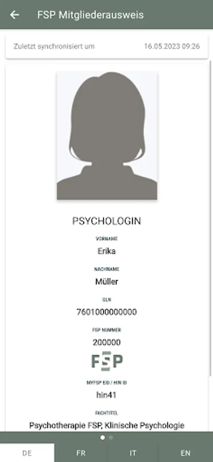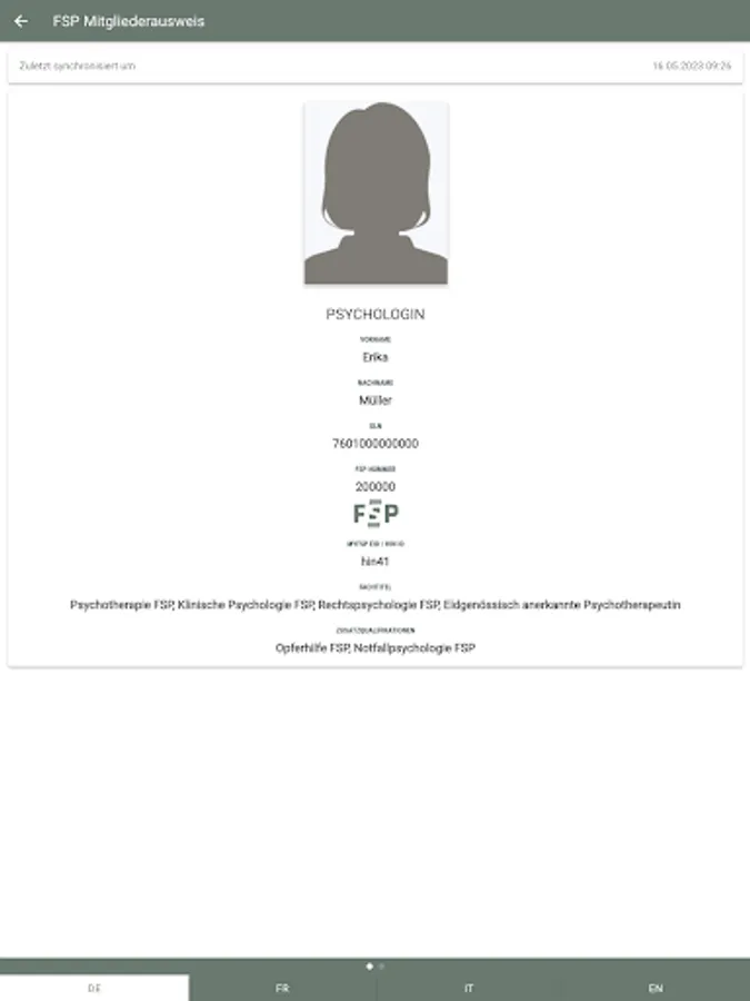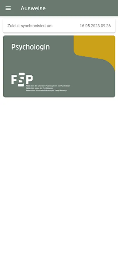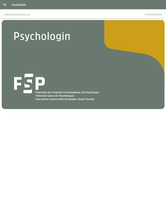 The myFSP app contains the electronic membership card of the Federation of Swiss Psychologists (FSP). It identifies you as a psychologist and shows the specialist titles you have acquired and additional qualifications.