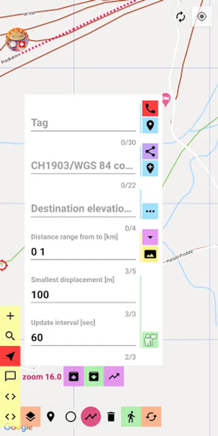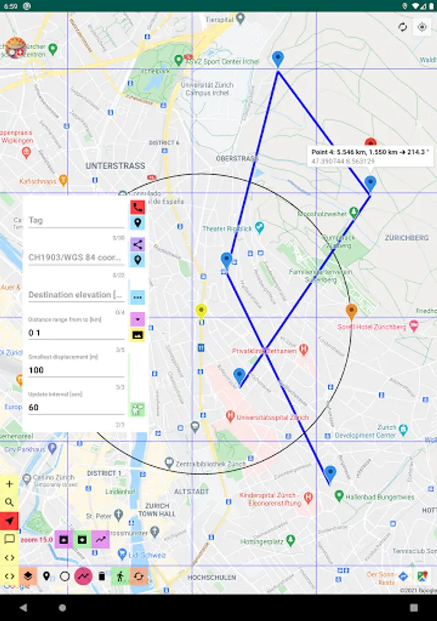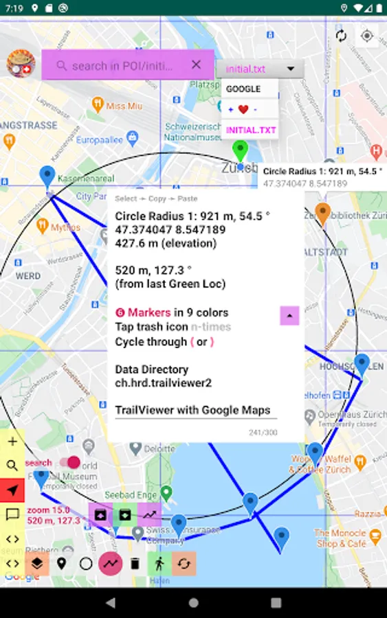 You can search for nearby points of interest in Switzerland as clusters (marker with open info field is the center, tap trash icon to have full functionality, needs SQLite data base, yellow button).