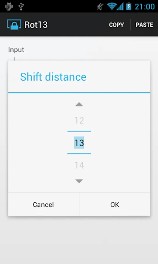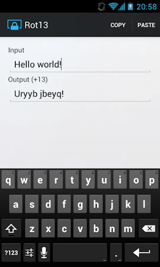 The app allows you to encrypt or decrypt a text with the ROT13 algorithm.