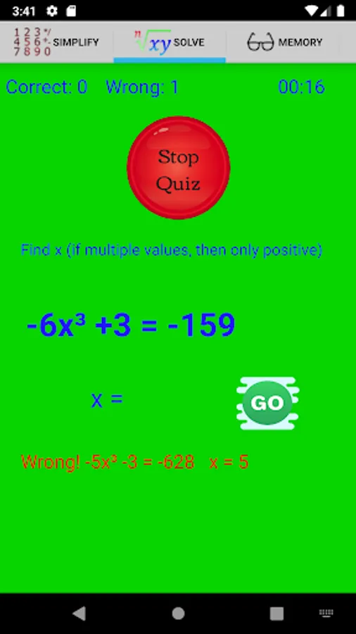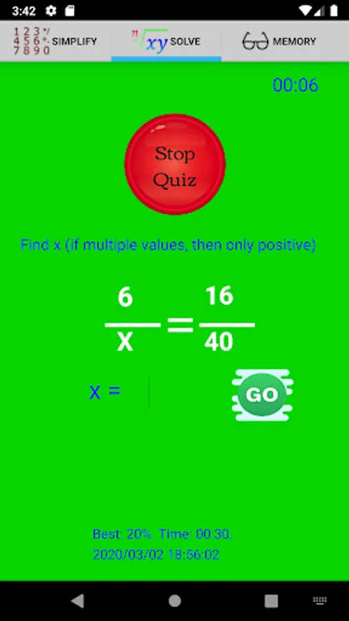 2. Equations. In easy level you have to solve a linear equation on x. For, example, -2x + 15 = 11 (solution: x = 2). This equation should ideally be solved without pen and paper. Other equations in this level are fractions, e.g. x/10 = 9/6 or 4/x = 20/5, etc. The medium level has quadratic equations and the Advanced level has cubic equations.