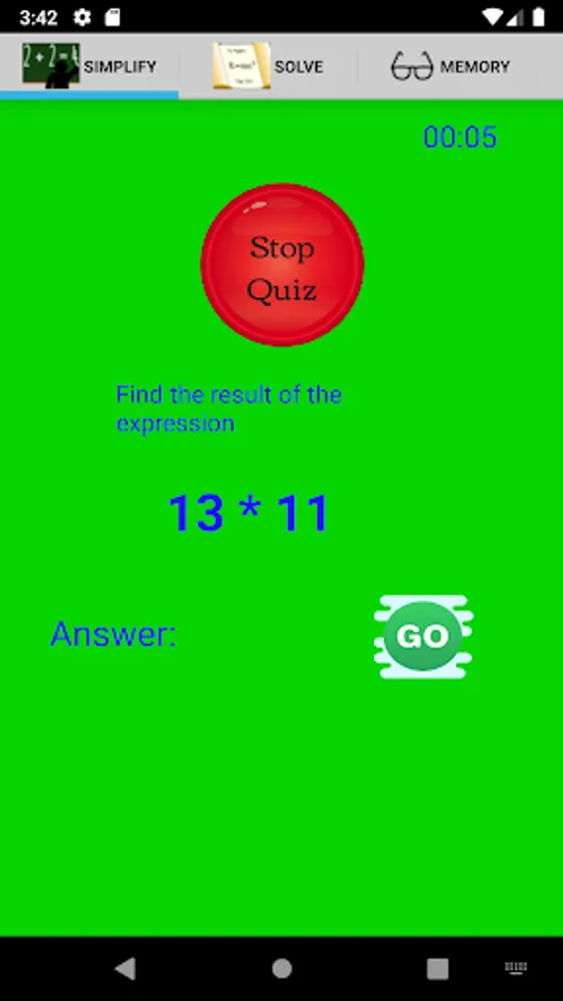 1. Expressions. In easy level you need to calculate multiplication, division, summation, and subtraction where at least two arguments are no greater than 10. Some examples are: 5x3=15, 25:5=5, etc. The medium level also has calculations, but now at least two arguments are no greater than 25. Some examples are: 13x13=169, 225:15=15, etc. The advanced level has more advanced expressions using numbers up to 30.
