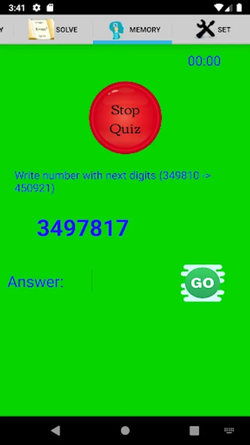3. Memory. Here you can see a number with between 4 and 7 digits (depending on the level) between 0.7 and 4 seconds (this is configurable in settings). You have to memorize it and then type a new number, having each digit increased by one. Nine gets converted to zero. For example, if the original number is 720983, the answer will be 831094.