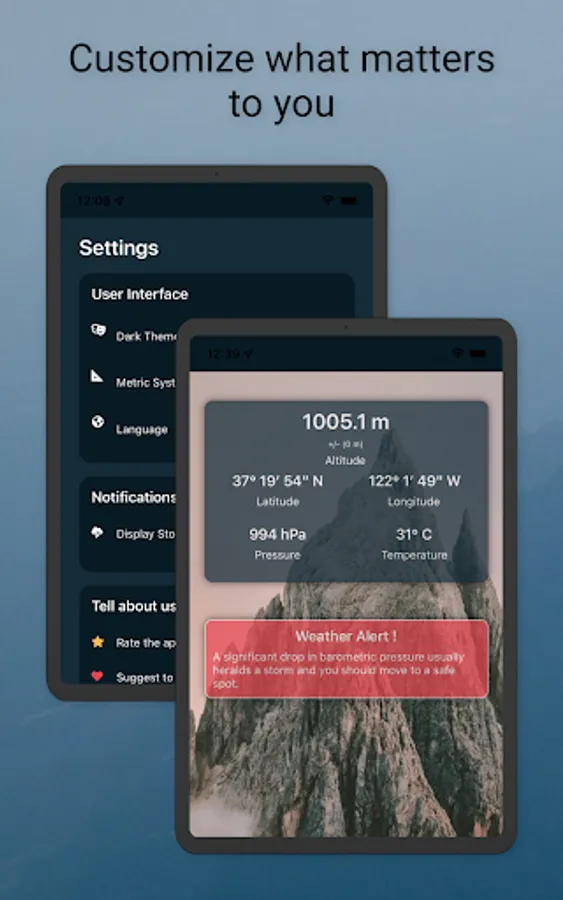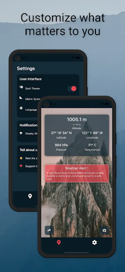 Altitudo notifies you when you might soon face a bad weather situation by continuously monitoring the air pressure and detecting a significant drop in air pressure.