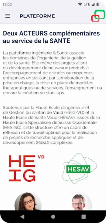 The Engineering-Health platform is a collaboration between the Haute École d'Ingénierie et de Gestion du canton de Vaud (HEIG-VD) and the Haute École de la Santé Vaud (HESAV) for applied research and teaching.