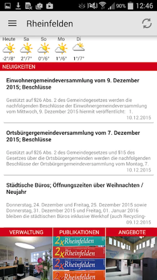Find out the town of Rheinfelden: Town weather, agenda, gastronomy, heritage, culture, leisure, life and living, business and labor, and city management, associations, politics. With integrated card function, automatic route and distance display and automatically updated content. Also be run offline. At times online eGovCenter integrated with online switch, GA reservation system and central user account.