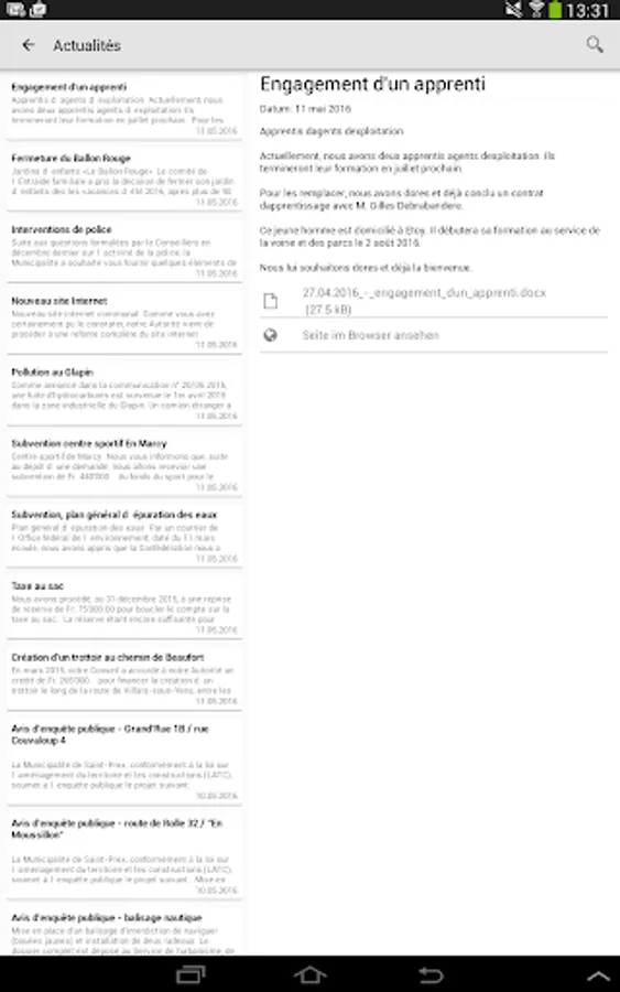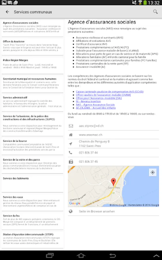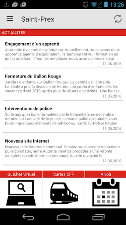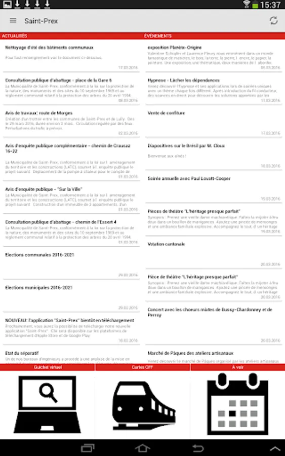 Tout savoir sur la commune de Saint-Prex: agenda, restaurants, points d'intérêts, hébergements, associations, entreprises, administration et politique. Mais également de nombreuses prestangs en ligne telles que commandes de cartes journalières CFF, Guichet virtuel et compte utilisateur. Fonction de carte intégrée, affichage de la distance and de l'itinéraire. Fonctions pour appels et pour e-mails intégrées, scanner QR, contenu actualisé automatiquement. Fonctionne aussi hors connexion. Notifications push lors de connexion.