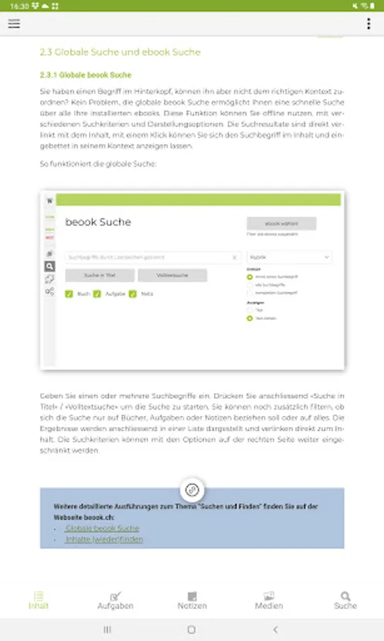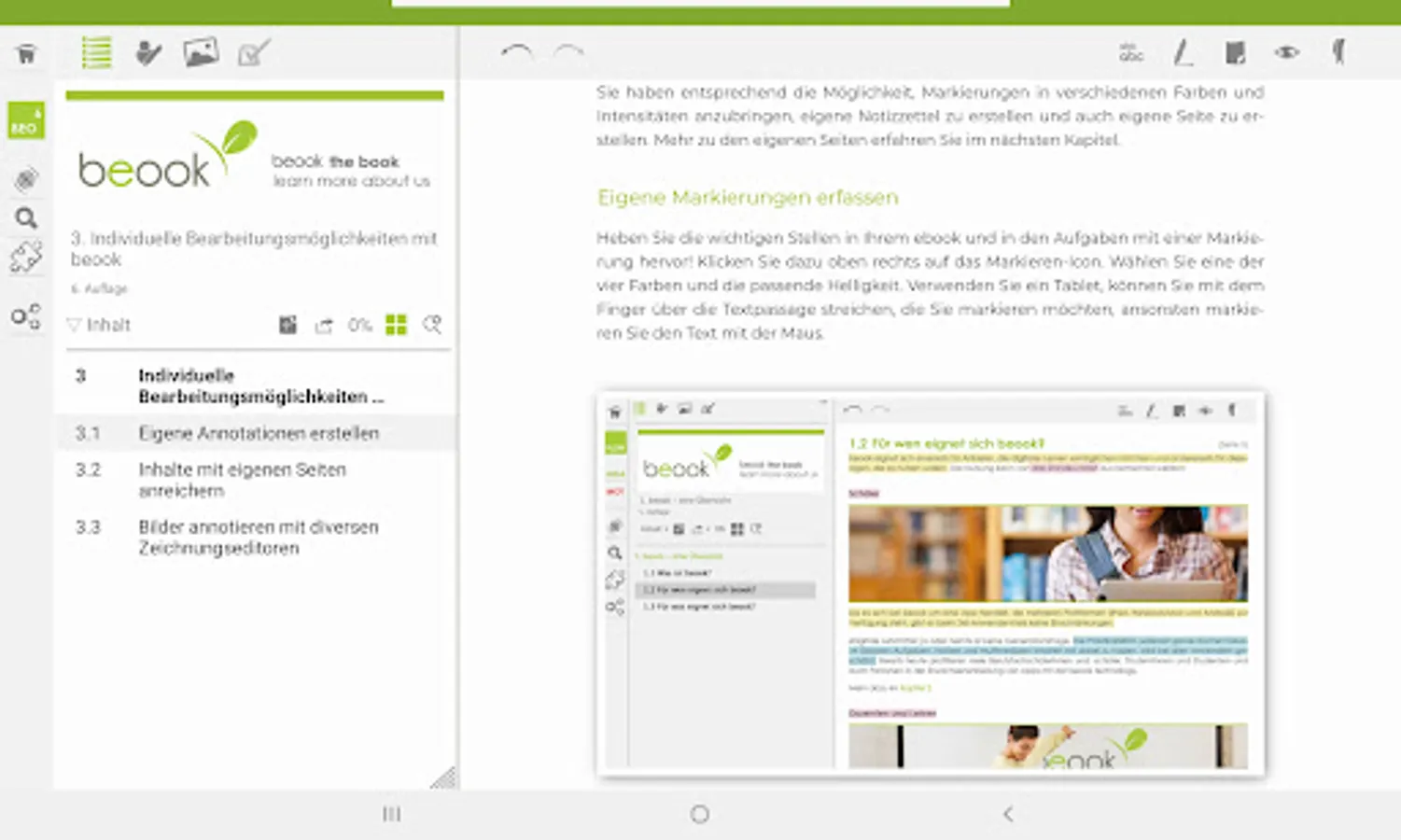 The beook app is a platform for digital teaching material of any kind provided by miscellaneous publishers, educational institutions and authors. Next to Android and iPad it is also available for iPhone, Windows and Mac computers.