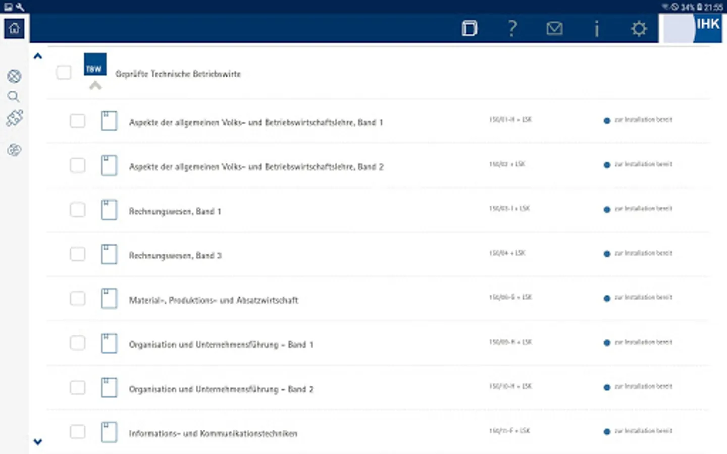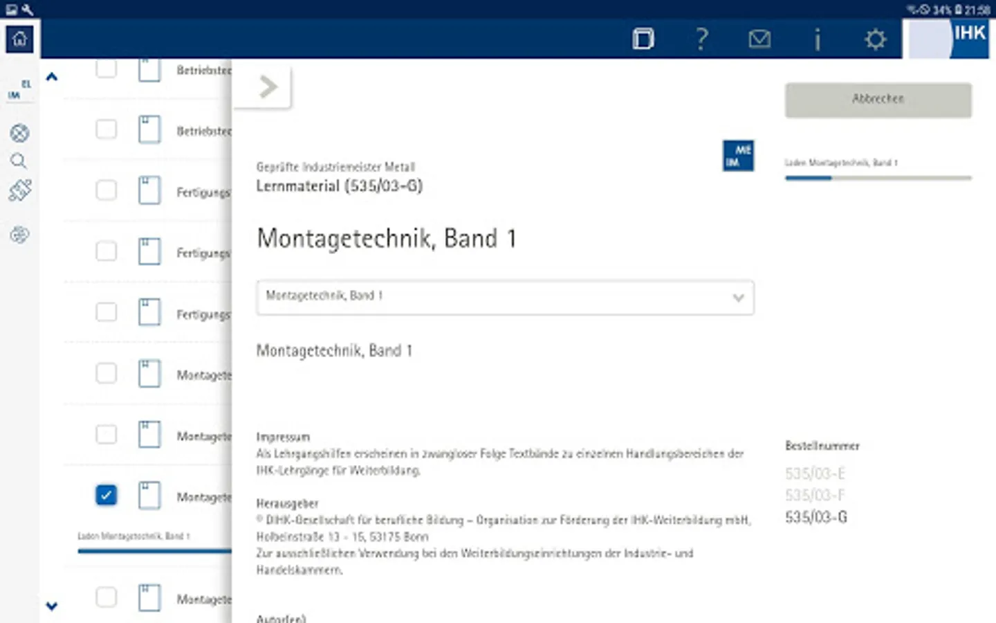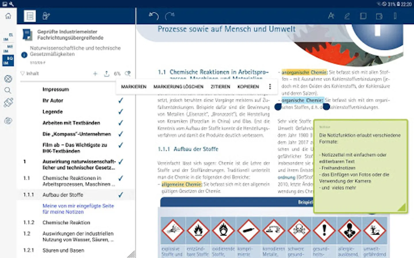 Editing functions such as adding different colored notes and markings, inserting your own pages including your own photos or URLs, an extensive full-text search over one, several or all installed volumes or on the Internet make working with the digital learning materials very convenient. Once you have loaded your materials into the app using the activation code, you will need i. d. Usually no internet connection for further processing. An Internet connection is only required for synchronization with the “IHK Lern mobil” cloud, for loading updates and for using the 3DQR codes available in some text volumes.