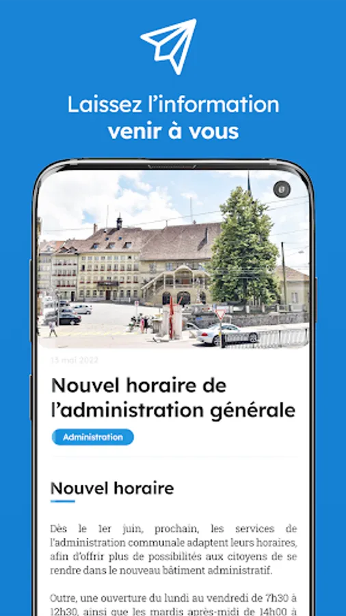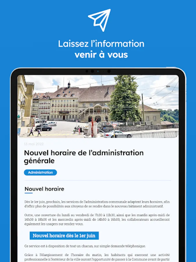Today, administrations have no way of communicating in real time with their inhabitants. This is why the Regional Association of Sarine has coordinated the implementation of this application available to municipalities and the main institutions of the district.