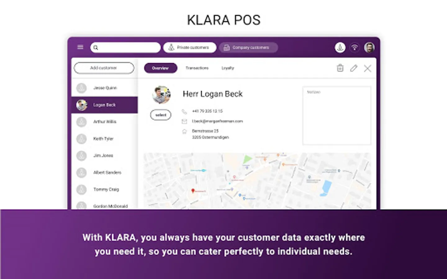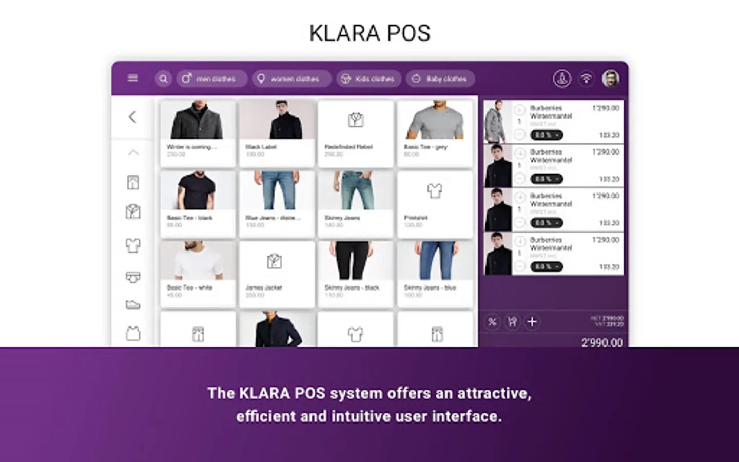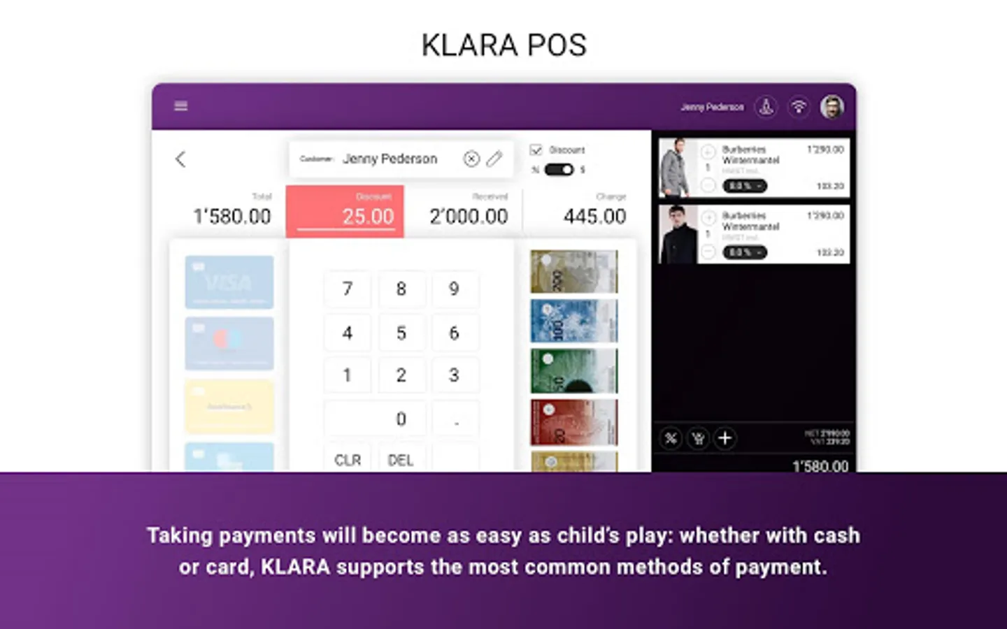 KLARA POS offers many other advantages: Manage your customers and assign sales to them. Keep an overview at all times, even with multiple branches, thanks to simple administration of the checkouts. Sell vouchers and let your customers use them to pay. You can also open several shopping carts for several customers at the same time, save them temporarily and retrieve them later.