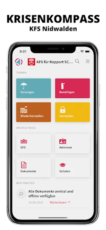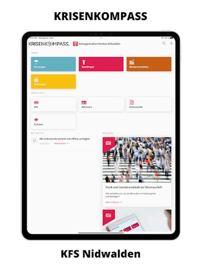 The KRISENKOMPASS® is the digital guide for the emergency organizations in the canton of Nidwalden. The cantonal management staff and each community management staff has its own instance, can store its own documents in a self-defined archive, access them offline via the app (mobile and for touch-enabled notebooks) and is mobile and up to date with the latest information.