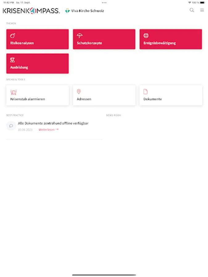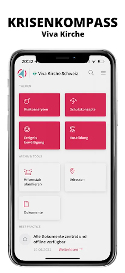 The KRISENKOMPASS® is the digital guide for the Swiss leadership and each individual Viva local church. Each local church is given its own instance, can store its own documents in its self-defined archive, can also access them offline via the app (for smartphones and touch-enabled notebooks) and is mobile and up-to-date. The allocation of authorizations for the crisis teams as users, editors or administrators is carried out by the management Switzerland resp. the administrator of the respective local church. Questions about technology / support: support@ crisis compass.ch or via www.17minutes.ch