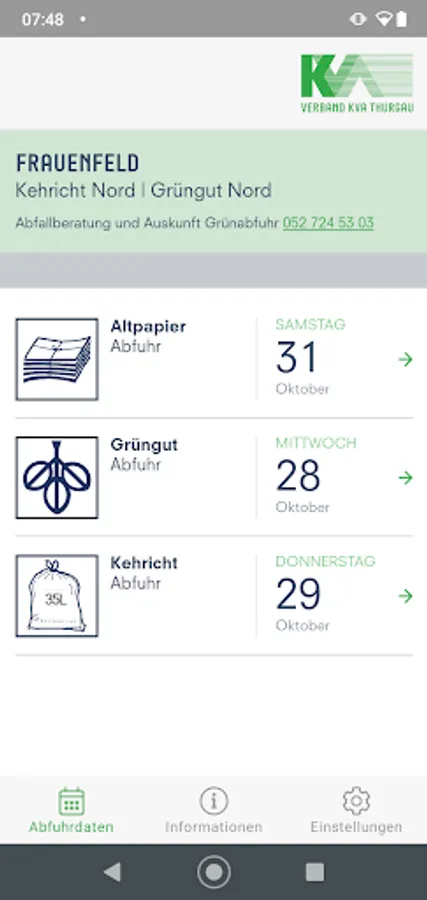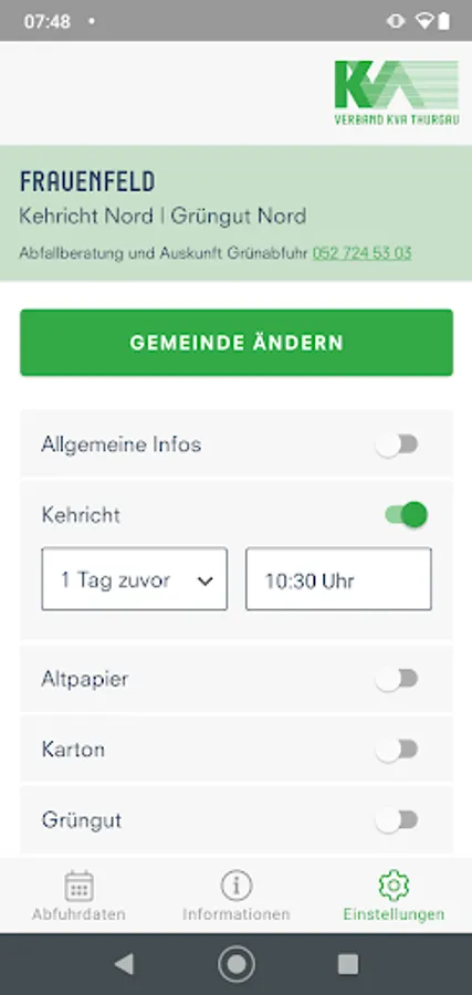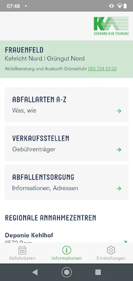 With the app, the KVA Thurgau puts personal needs in the foreground. Simply select your municipality and you will receive all the latest information on disposal and collection. The KVA app is a practical tool to help you dispose of properly.