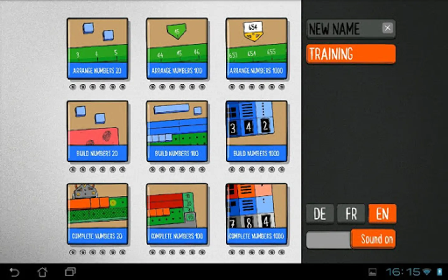 This app is available in two versions with an identical content. However, unlike the multi-user version (in which 4 levels are available simultaneously ) this single-user version can only deal with one learning level.