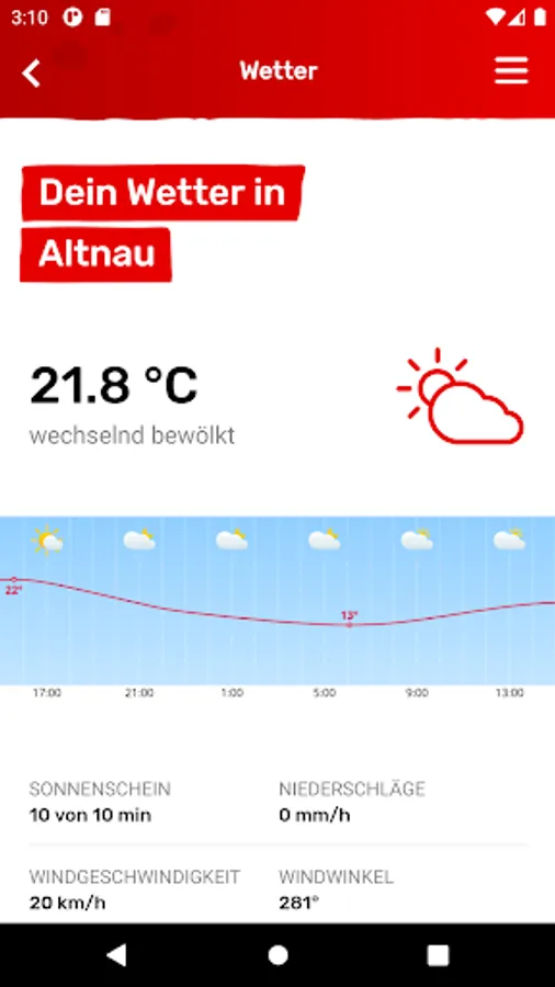 • Weather: umbrella or sunscreen? With our weather service for your area and forecasts for the next seven days, you will not experience any nasty surprises. And with the webcam for Altnau you can check the current weather conditions live.
