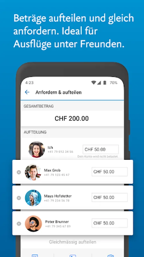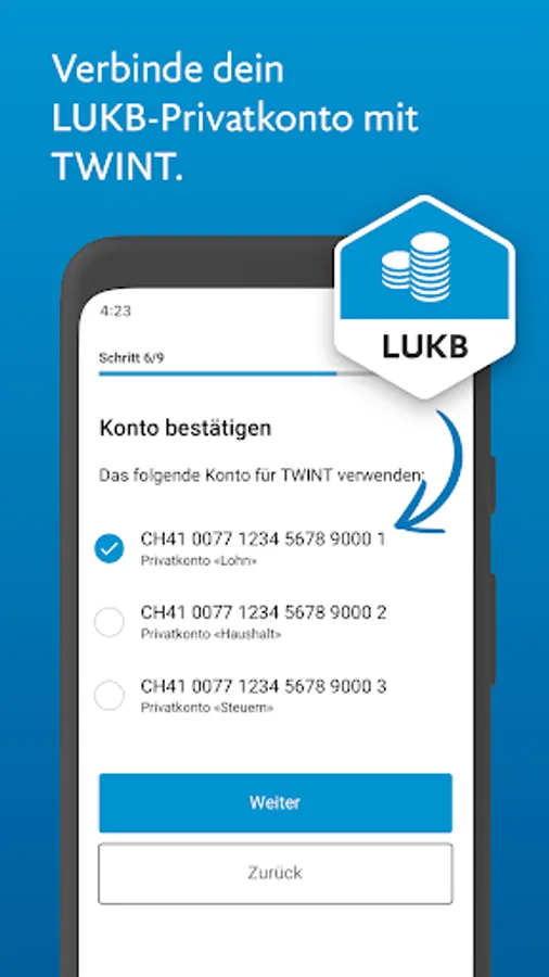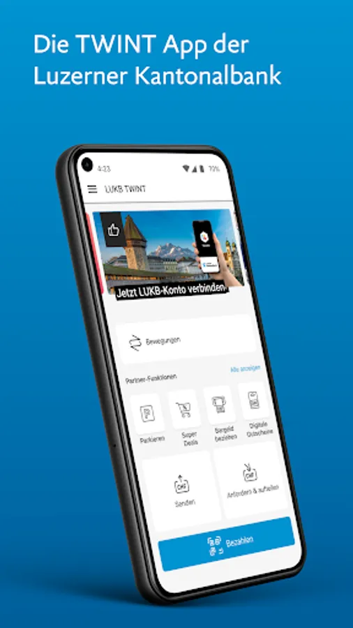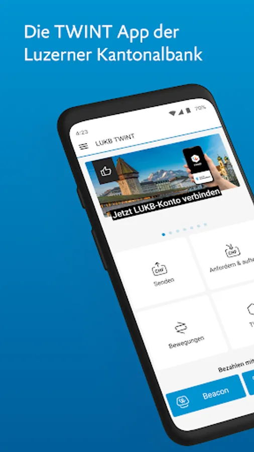 With the LUKB TWINT app you can connect directly to your LUKB private account. Your money transfers or purchases will be debited directly from your account and amounts received will be credited.