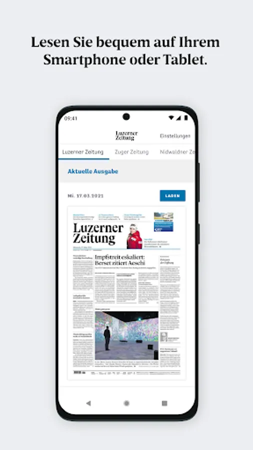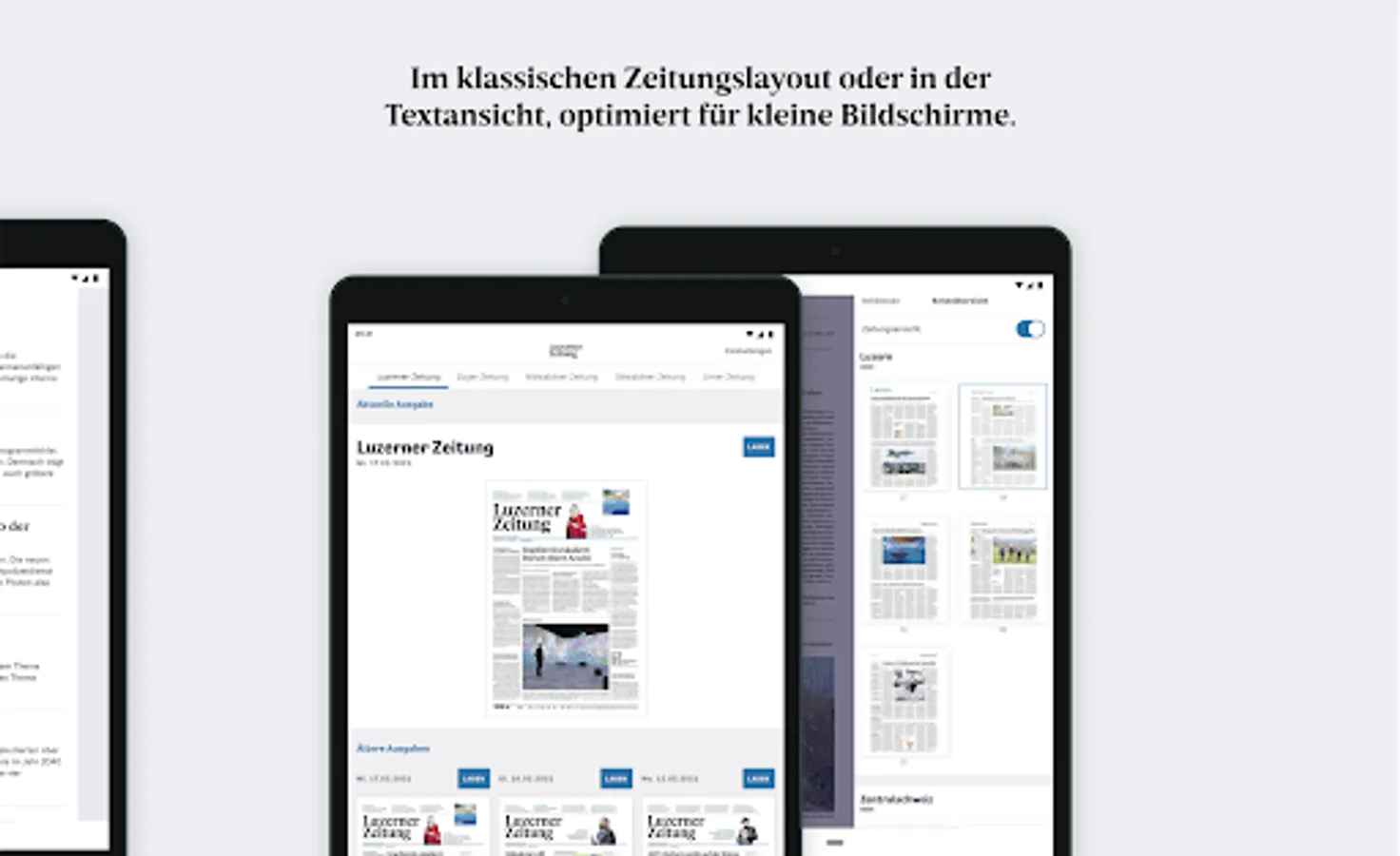 With the E-Paper for smartphone and tablet you are first informed on any week including Sundays - wherever you are. With our app read the "Luzerner Zeitung", "Zuger Zeitung", "Nidwaldner newspaper", "Obwaldner newspaper", "Urner Zeitung", "Central Switzerland on Sunday" and all supplements in digital form.