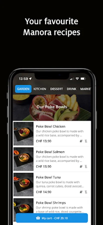 Choose from the wide range of salads, poké bowls, soups, pasta, antipasti, desserts, fruit juices, wine and much more. Manora offers dishes for many diets (vegetarian, vegan, gluten free, lactose free, etc.). The ingredients are natural, fresh and of the highest quality: seasonal vegetables, cereals and pulses that are mostly of organic origin, Swiss poultry, free-range eggs, fish from sustainable fisheries, desserts without animal gelatine.