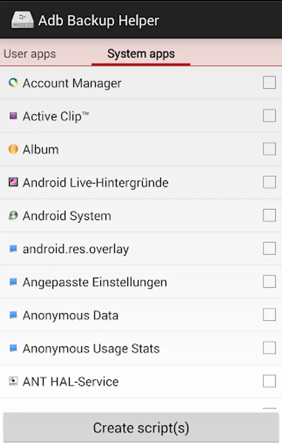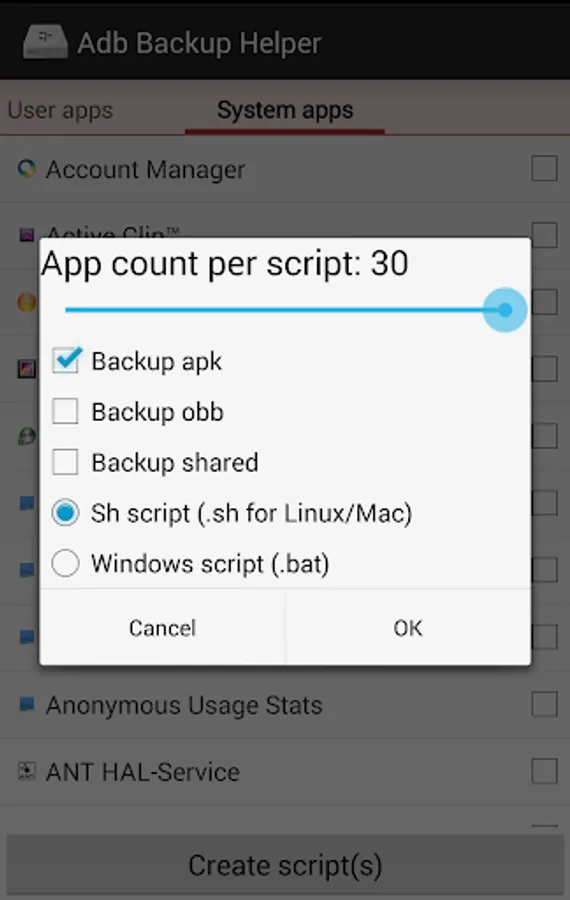 This tool generates sh and bat scripts to use with adb to backup the app. The application is able to split the apps in multiple files. (Because adb backup can only handle a couple of apps per backup)
