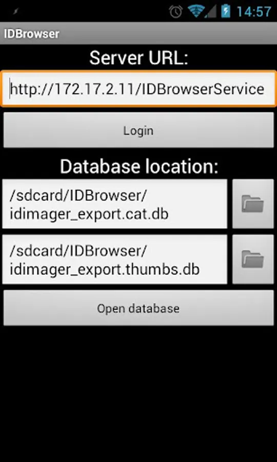 To export a database enable the "Save previews in database" function in the IDImager application under "Options" - "Previews". Then select the images to export and choose "Transfer" - "Export to SQLite database". Copy the two SQLite files to your sdcard and select those two files on the login screen. (Install OI File Manager to select the files using the file browser)