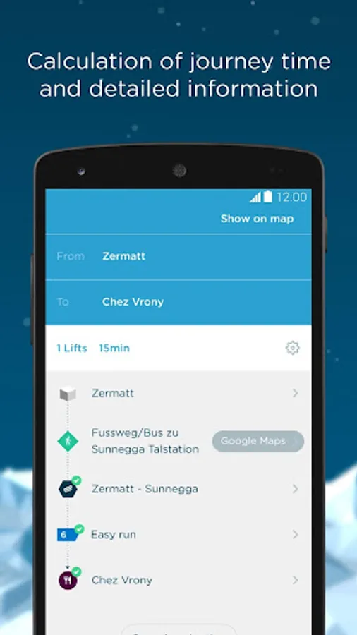 The app always takes account of the opening times of ski runs and lifts in the ski area, provided that the mobile device is connected to the internet. This should not pose a problem since all Zermatt Bergbahnen AG stations are equipped with free wireless LAN.