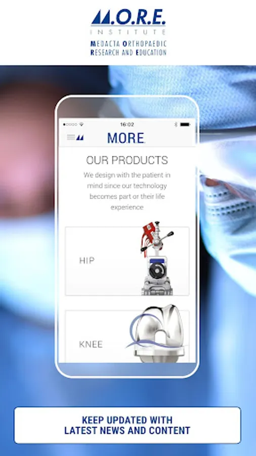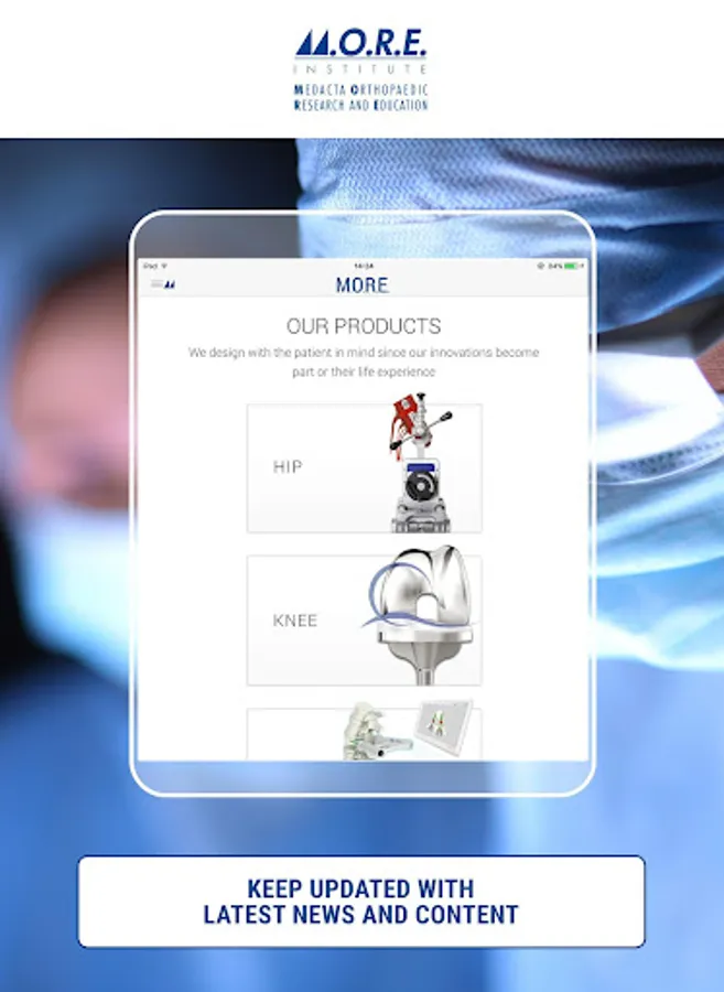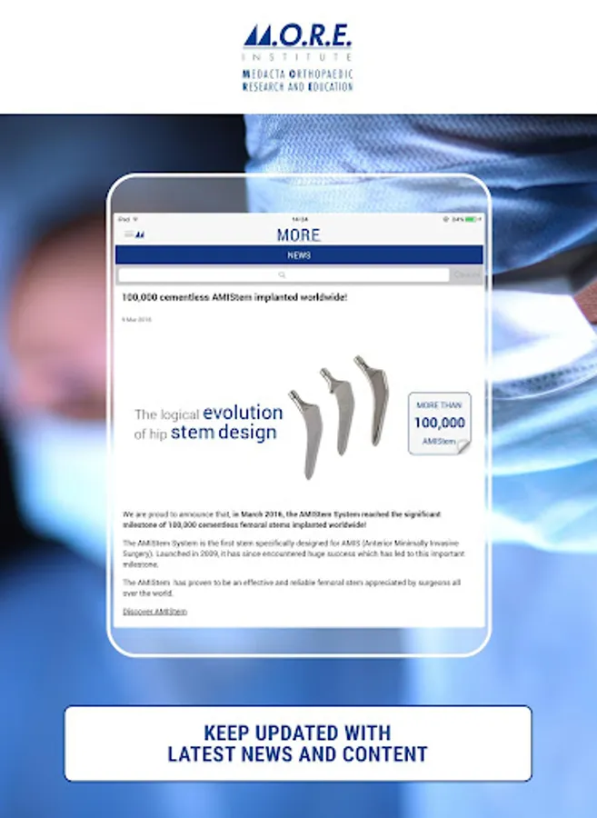 The Medacta M.O.R.E. App is our new application for the Medacta Orthopaedic Research and Education Institute. With this app you have 24/7 access to the most important information regarding the M.O.R.E. Institute and Medacta events (Congresses, Learning Centres, etc.), along with all the Medacta educational material, tablet or mobile device, both online and offline!