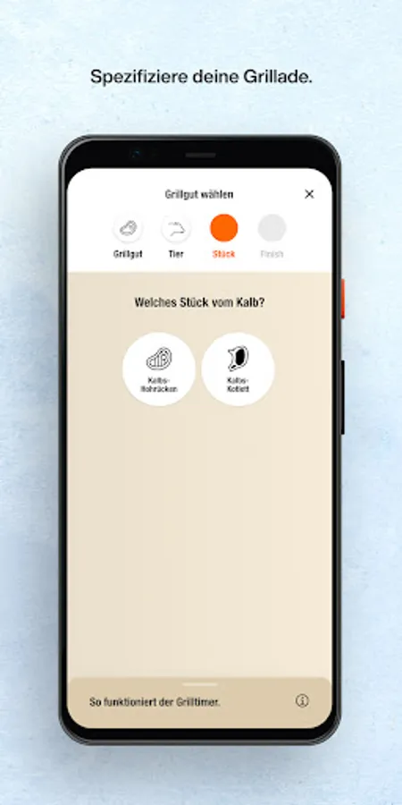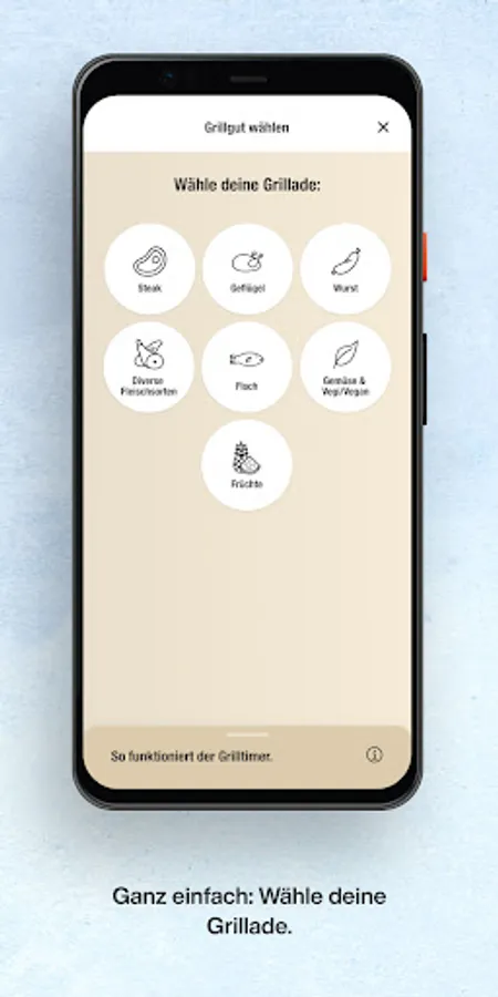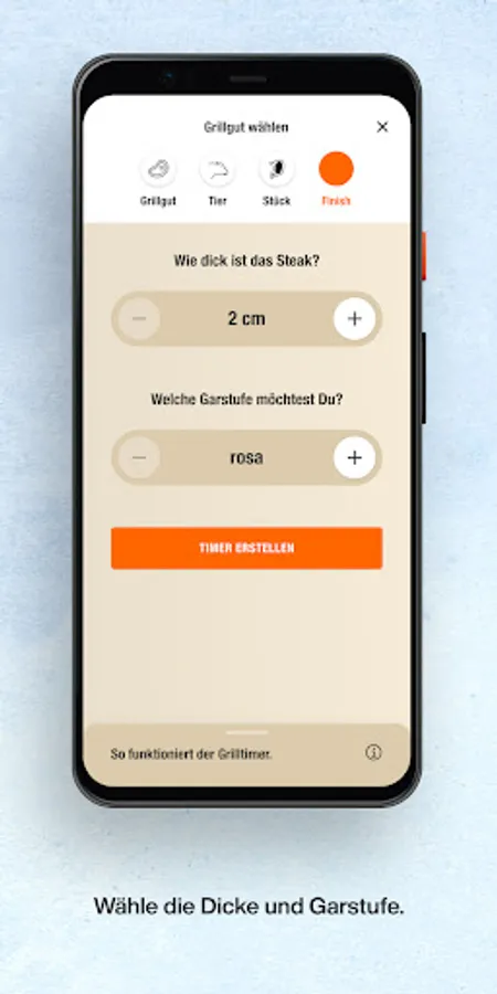 Simply select a piece of grilling and start the timer. Our culinary experts have selected the perfect cooking points for all predefined grilled items.