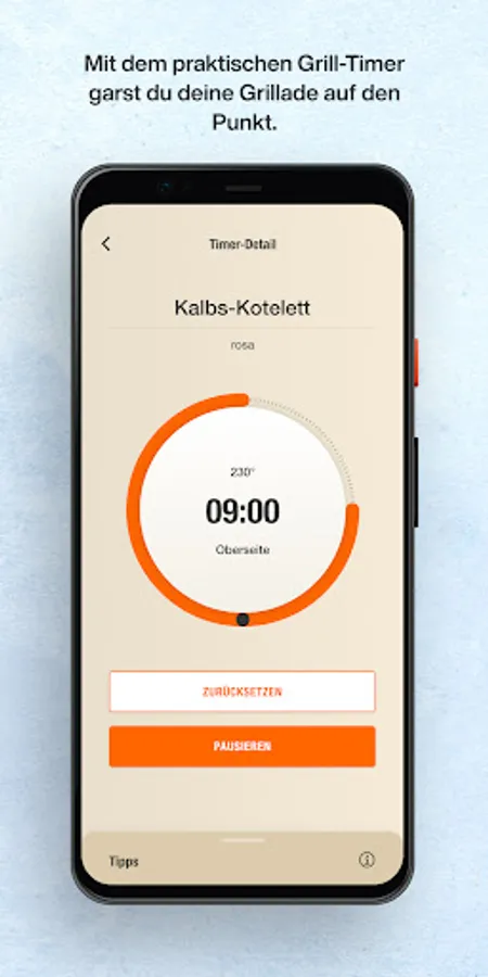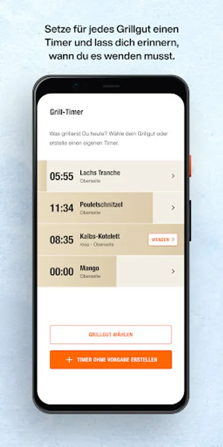 You don't want to stand at the grill all the time? No problem. The grill timer app reminds you when you should turn your grilled food and when it is ready.