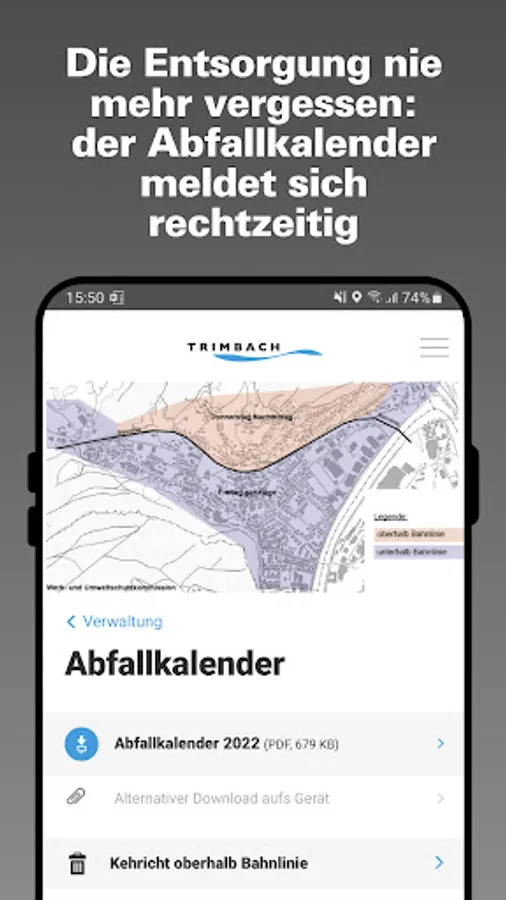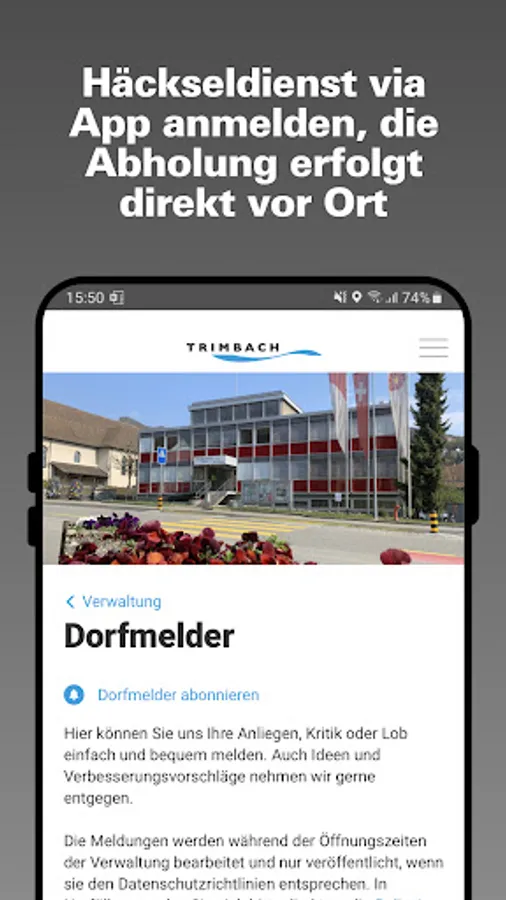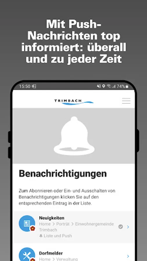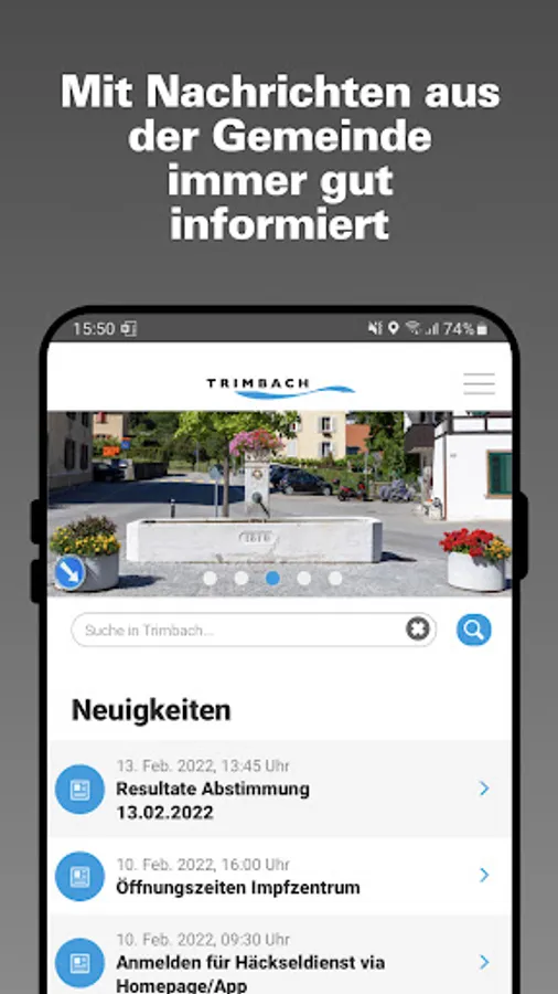 The Trimbach community app includes information from politics and culture. The Trimbach community app offers Trimbach residents a contemporary information and communication platform. They are informed about news or upcoming events by means of push messages. Residents can contact the community directly via the app or network with one another.