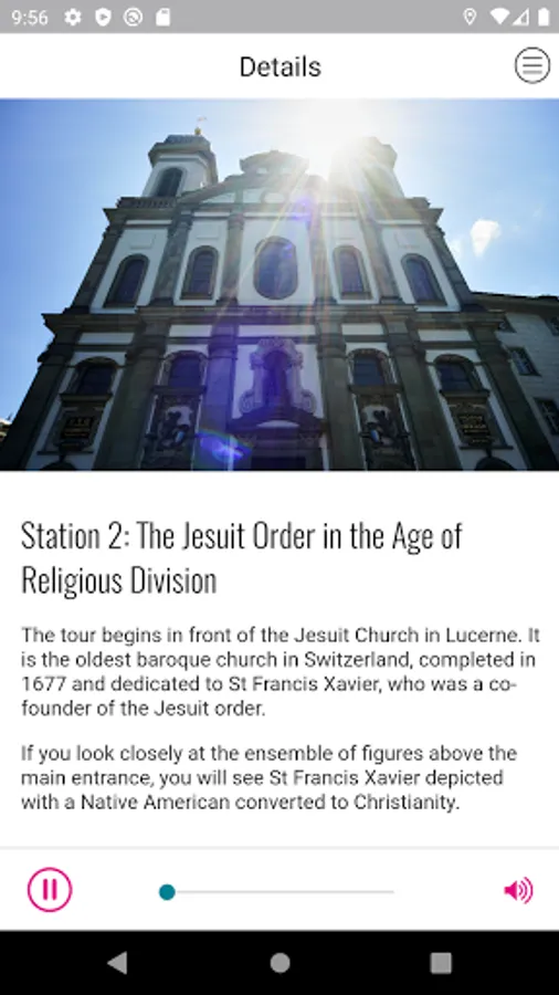Turn on the sound and GPS tracking services on your phone and enable the notification feature in the settings of this app. Accept the app's access to "Media and files". Although your "media and files" will NOT be accessed by the app, your consent is still required. By tapping the map icon, you will continuously see your current location. If you tap the location icon, you will see the list of all points of interest. As you approach a point of interest, a message will appear on your screen and the audio commentary will play automatically. You can also search for all the locations yourself using the map or the list of locations and call up the relevant information with a click.