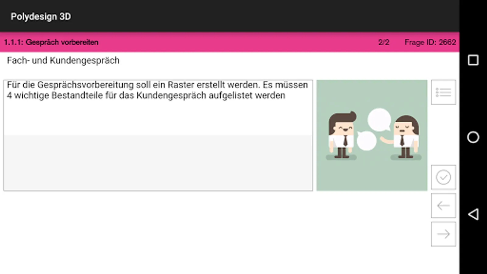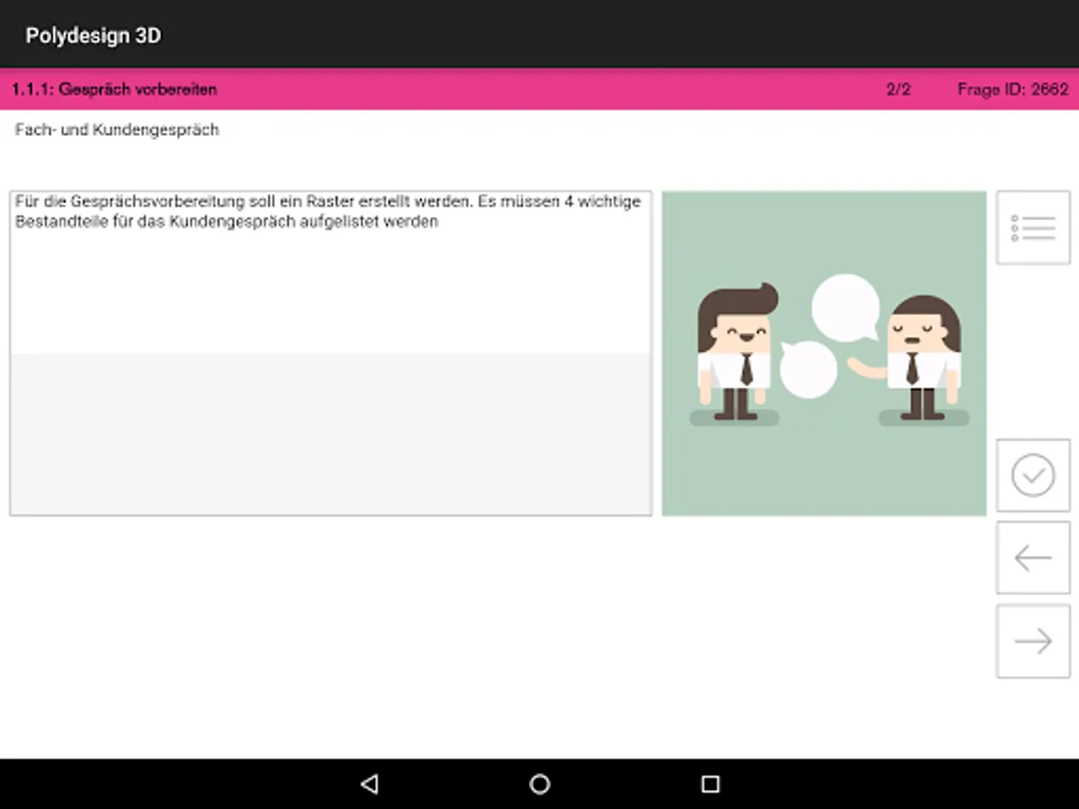 The app includes questions, answers, pictures and movies to the occupation Polydesign 3D. It enables learners to improve their education quality and is an excellent way for the vocational trainers described in curriculum teaching content to provide for a professional three-dimensional design, attractive.