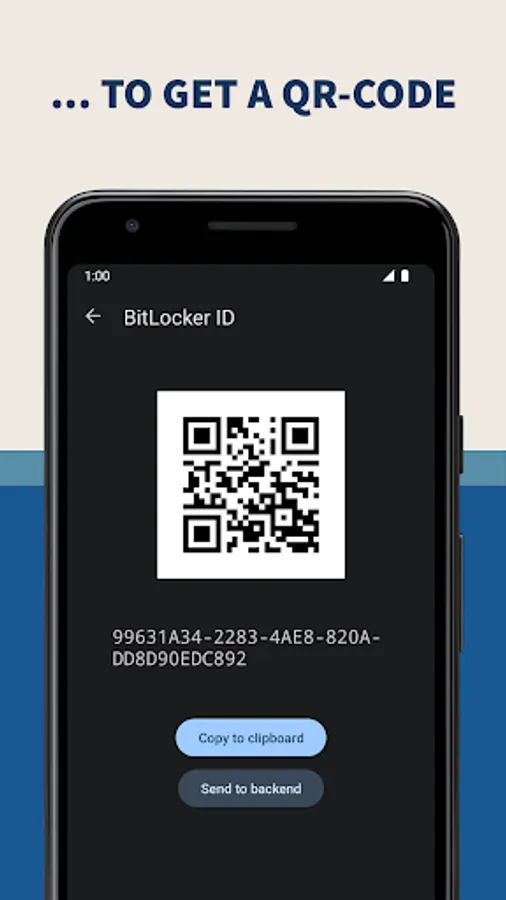 Tired ot typing the 36-55 chars long BitLocker Recovery ID or Key? Just scan it with BitQR and a QR-Code is generated. You can then easily scan it with a barcode scanner or send it directly to your backend for further processing.