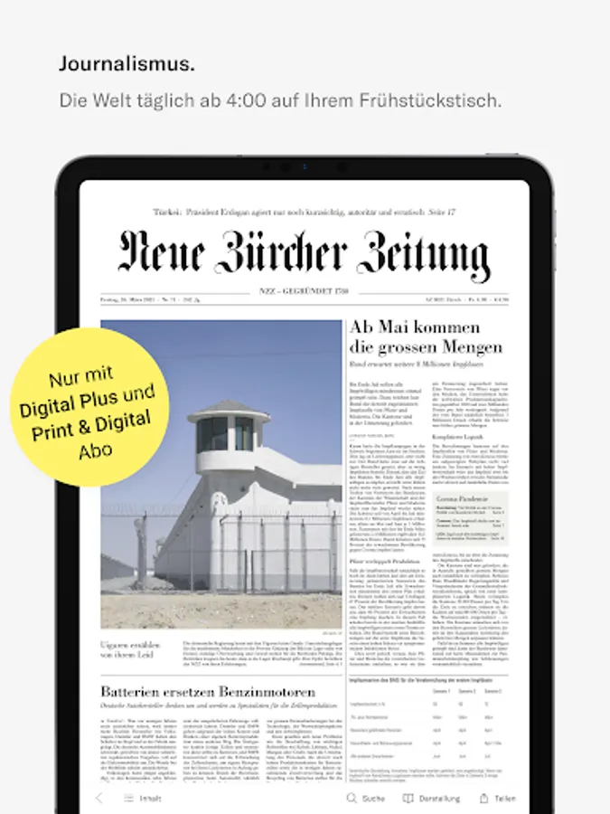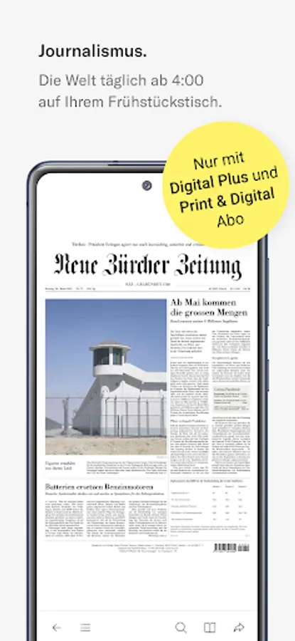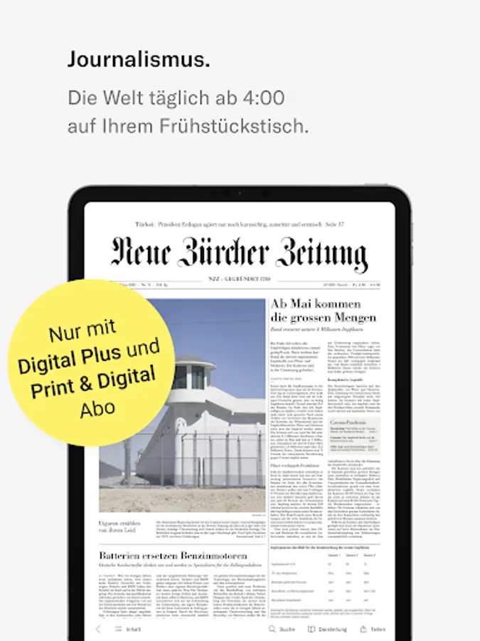 The NZZ E-Paper App exclusively for our Digital Plus and Print & Digital subscribers. For digital subscribers, we recommend our “NZZ Nachrichten (Digital)” news app.
