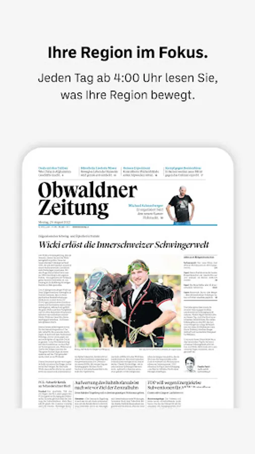 The "Obwaldner Zeitung" is available every day from 4 a.m. in the e-paper app. The output is downloaded either automatically or manually. As soon as the current issue has been downloaded, you can read it without an internet connection, at home or on the go.