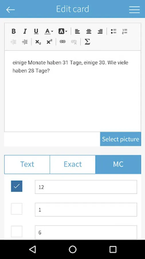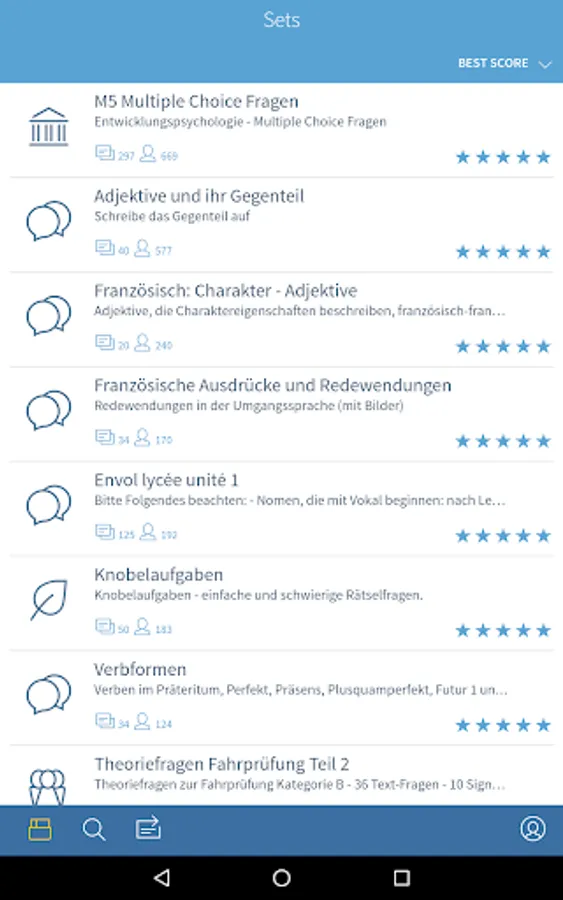 With card2brain, you review the flashcards systematically according to Sebastian Leitner’s principle of spaced repetition in five compartments. Once all flashcards are in the last compartment, you are ready for the exam. The three types of answers, the picture upload feature, the formula editor, and the possibility to reverse the order of learning make studying in all fields of knowledge easy and fun and in no time, you will become a foreign language professional.