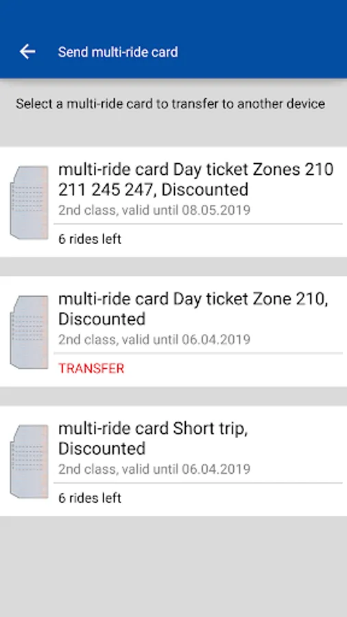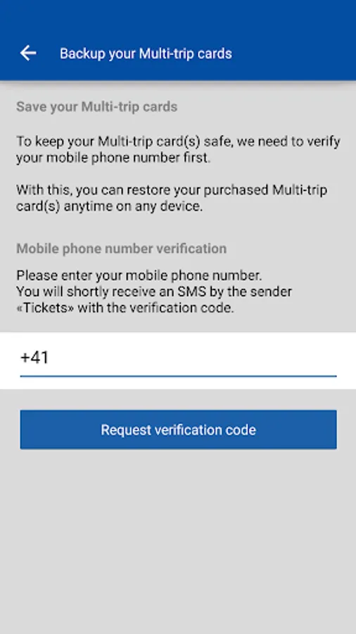 Backup your multi-trip cards with a one-time registration via SMS. This allows you in case of a device replacement or device loss to continue to use previously purchased multi-trip cards. By activating the option all previous and new purchases of your multi-trip cards will be secured and linked to your mobile phone number.