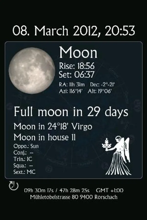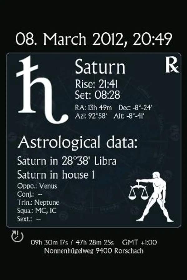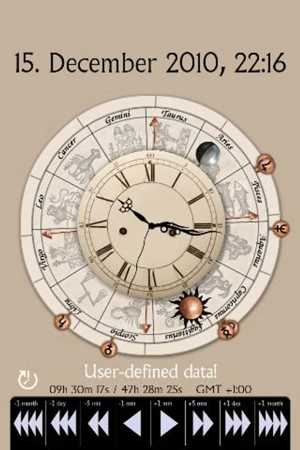 Set your own time and turn the hands with your finger! Watch how the celestial bodies move, see how planets retrograde and the phases of the moon change.