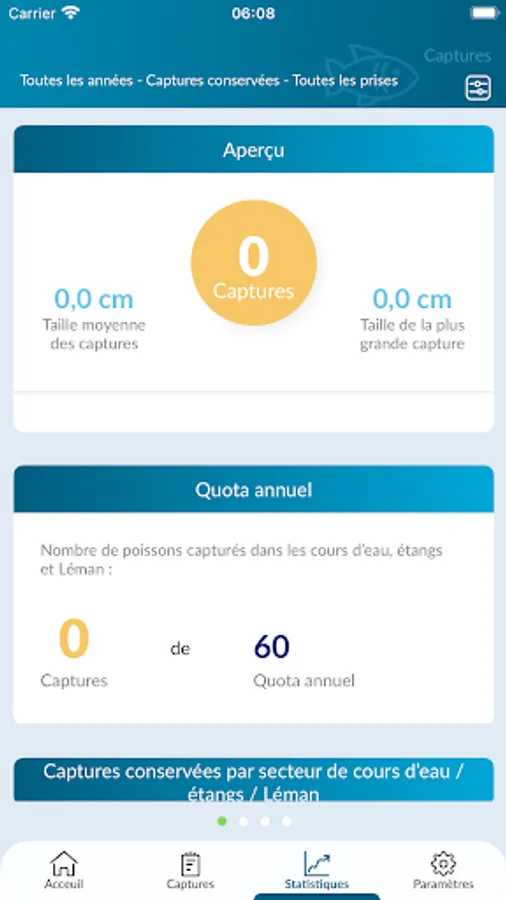 The user also benefits from tools on the personal history of his fishing sessions and on his individual statistics (duration of a session, fishing environment, success rate, size of fish, type of bait used, etc. ).