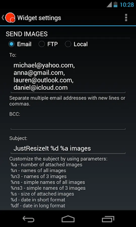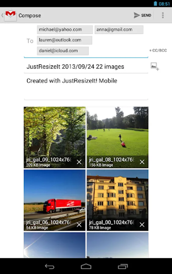 JustResizeIt! Mobile is the ultimate solution to resizing and sending unlimited number of photos all at once, with one click. It's that easy!